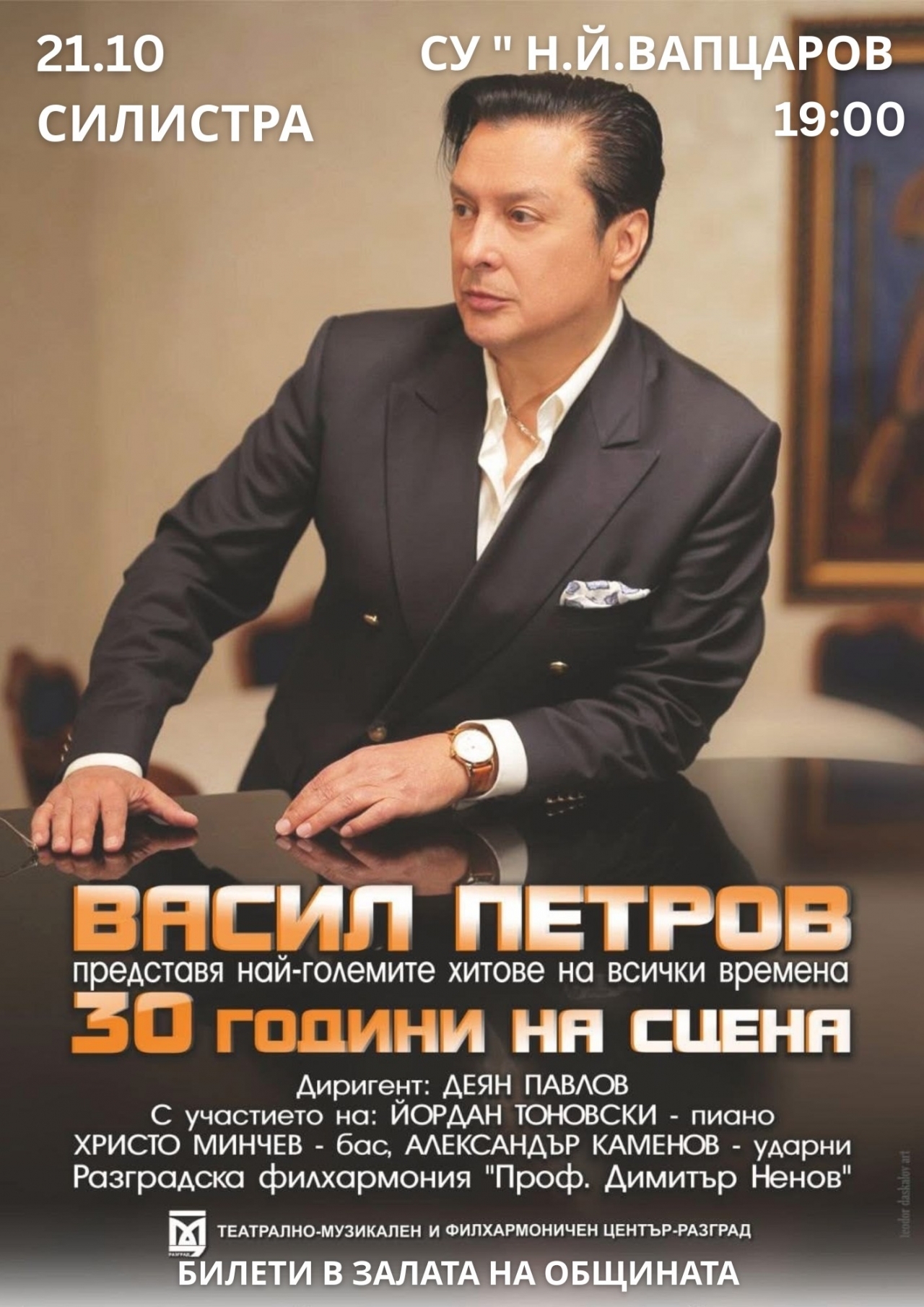 Силистра ще бъде част от новия сезон на концертната програма на Васил Петров. На 21 октомври 2025 г. от 19:00 ч. в залата на СУ "Н. Й. Вапцаров" джазовата легенда ще излезе на сцената заедно с Разградската филхармония "Проф. Димитър Ненов", за да представи най-големите хитове на всички времена в симфонична версия.