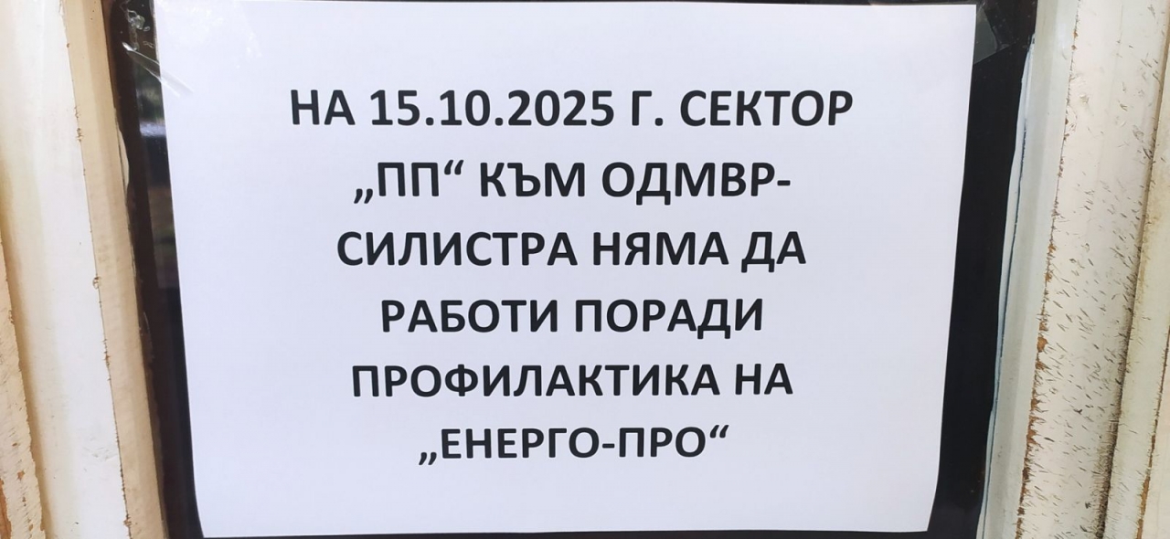 На 15 октомври 2025 г. (сряда) Сектор "Пътна полиция" към ОДМВР – Силистра няма да обслужва граждани поради извършване на профилактични дейности от страна на енергийното дружество ЕНЕРГО-ПРО, съобщават от областната дирекция.