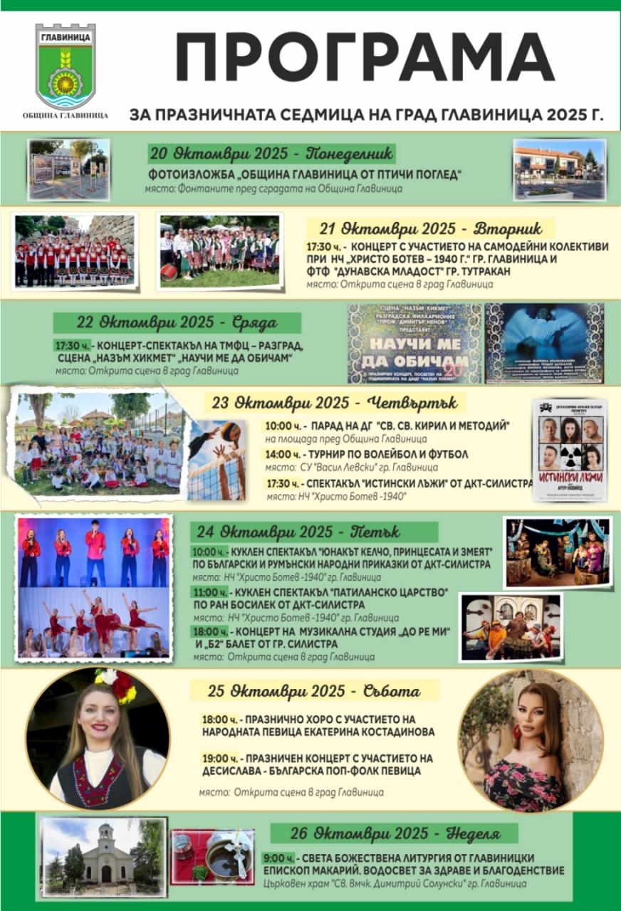 Община Главиница представи официалната програма за празничната седмица на града, която ще се проведе от 20 до 26 октомври 2025 г.