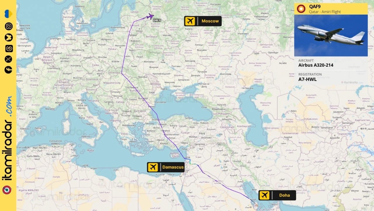 Според международни източници, самолетът е излетял от Доха (Катар) и е кацнал в Сирия около 3:00 ч., където е престоял приблизително два часа, преди да излети отново с президента на борда, насочвайки се към руската столица Москва.
