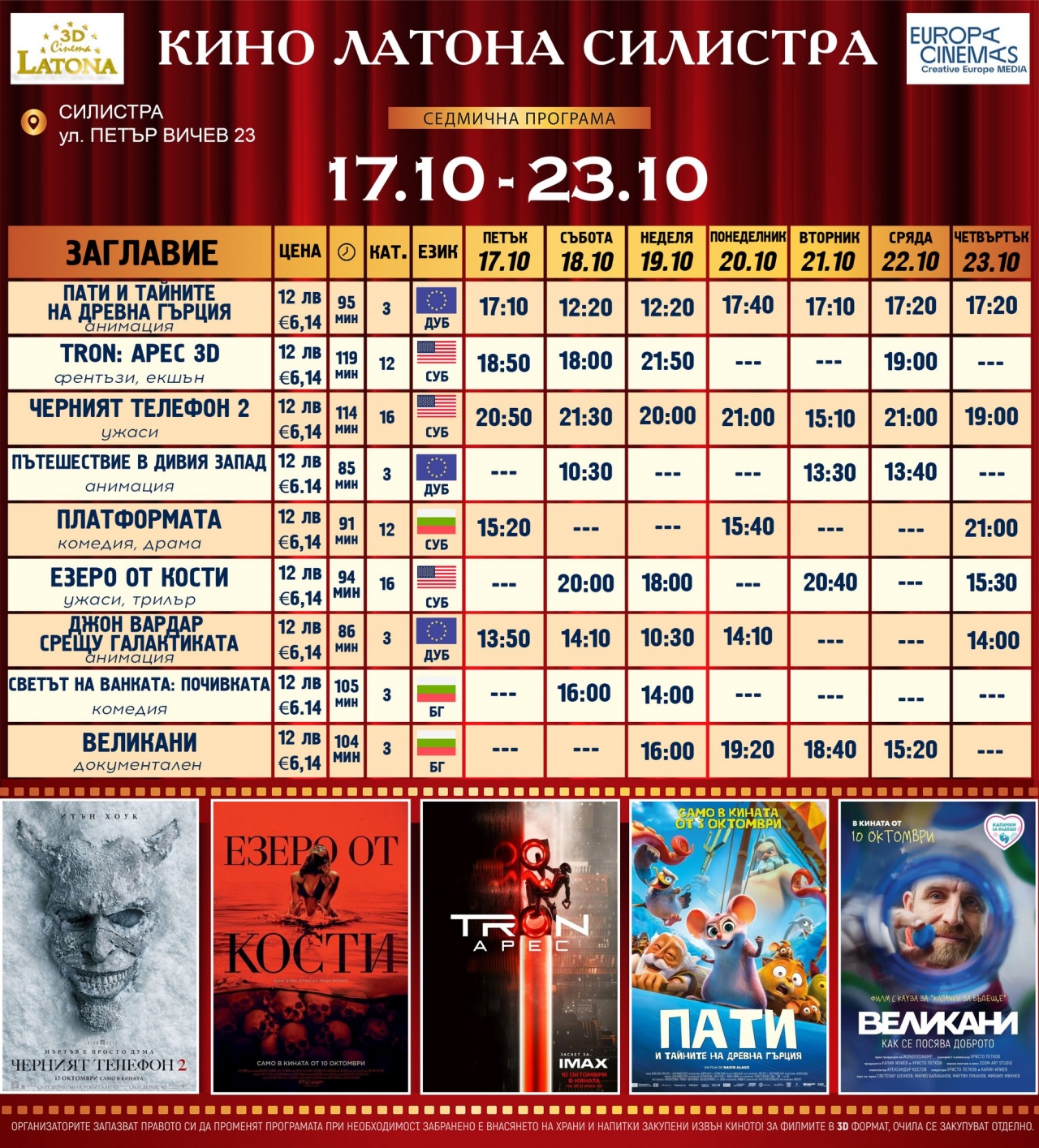 📅 Пълната програма на прожекциите от 17 до 23 октомври е достъпна на страницата на кино "Латона" – Силистра, както и на място в киното на ул. "Петър Вичев" 23.