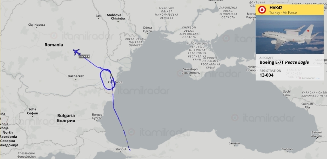 Военен самолет за ранно предупреждение и контрол Boeing E-7T "Peace Eagle" (рег. 13-004, позивна HVK42) на турските военновъздушни сили проведе в неделя наблюдателна мисия над западната част на Черно море, в район близо до област Силистра.