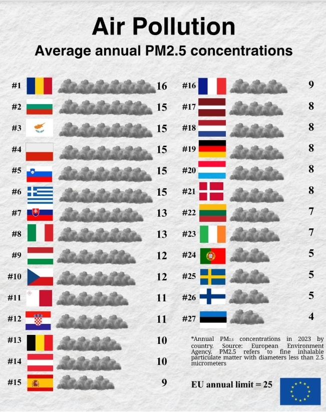 На противоположния полюс са най-чистите страни в Европа – Естония, Финландия и Швеция, където нивата на замърсяване спадат до 4–5 микрограма.