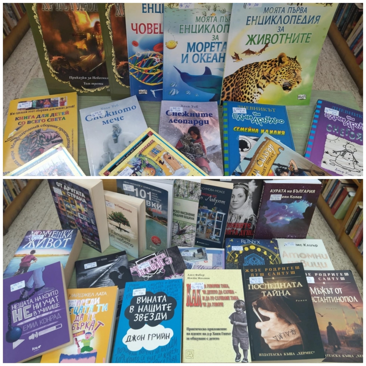 Сред дарените издания има както популярни романи на български и чуждестранни автори, така и детски енциклопедии, приключенски истории и класически произведения. Читателите ще могат да се насладят на заглавия като "Мъжът от Константинопол" и "Последната тайна" от Жозе Родригеш душ Сантуш, "Вината в нашите звезди" от Джон Грийн, "Нещата, на които не ни учат в училище" от Емил Конрад, както и редица увлекателни книги за деца – "Приключенията на Лукчо", "Снежните леопарди", "Моята първа енциклопедия за животните" и много други.