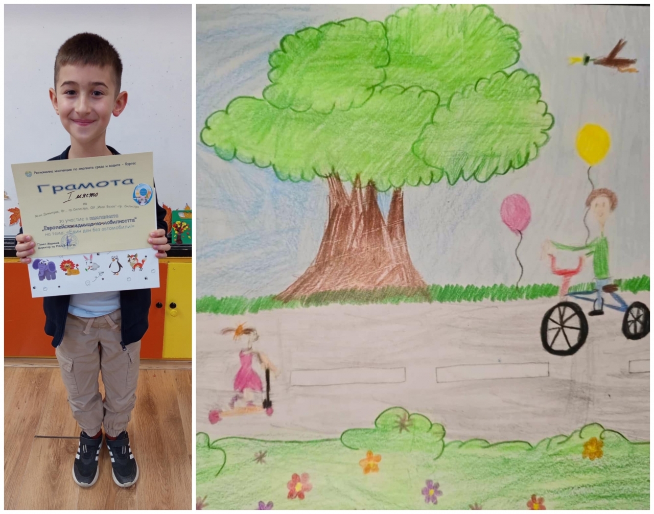 Ясен Димитров от 2.а клас на Основно училище "Иван Вазов" – Силистра с класен ръководител С. Хамди спечели първо място в националния конкурс за рисунка "Един ден без автомобили", организиран от РИОСВ – Бургас.