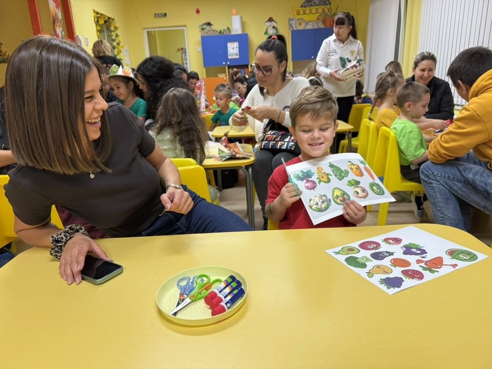Малчуганите приветстваха своите родители с песни и стихчета, а след това всички заедно се включиха в творческа работилница, в която изработиха голяма цветна дъга от плодове и зеленчуци – символ на разнообразното и балансирано хранене. От червените ябълки до лилавите сливи – всяко дете добави своето цветно парченце в общото произведение.