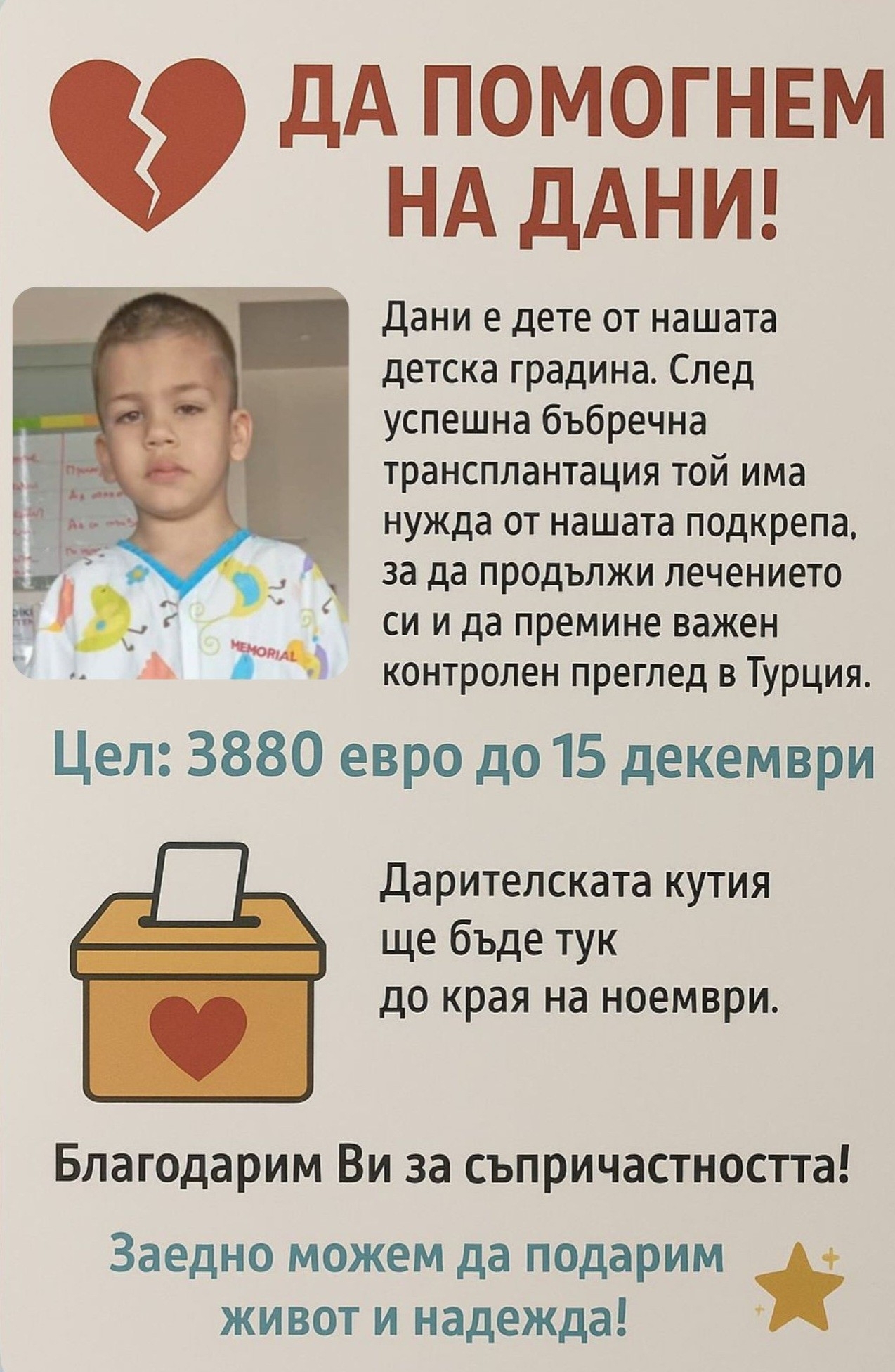 От детската градина призовават родители, граждани и съпричастни хора да подкрепят каузата, за да може Дани да продължи лечението си и да получи необходимата грижа. Малкият жест на доброта може да направи голяма разлика в живота на едно дете.