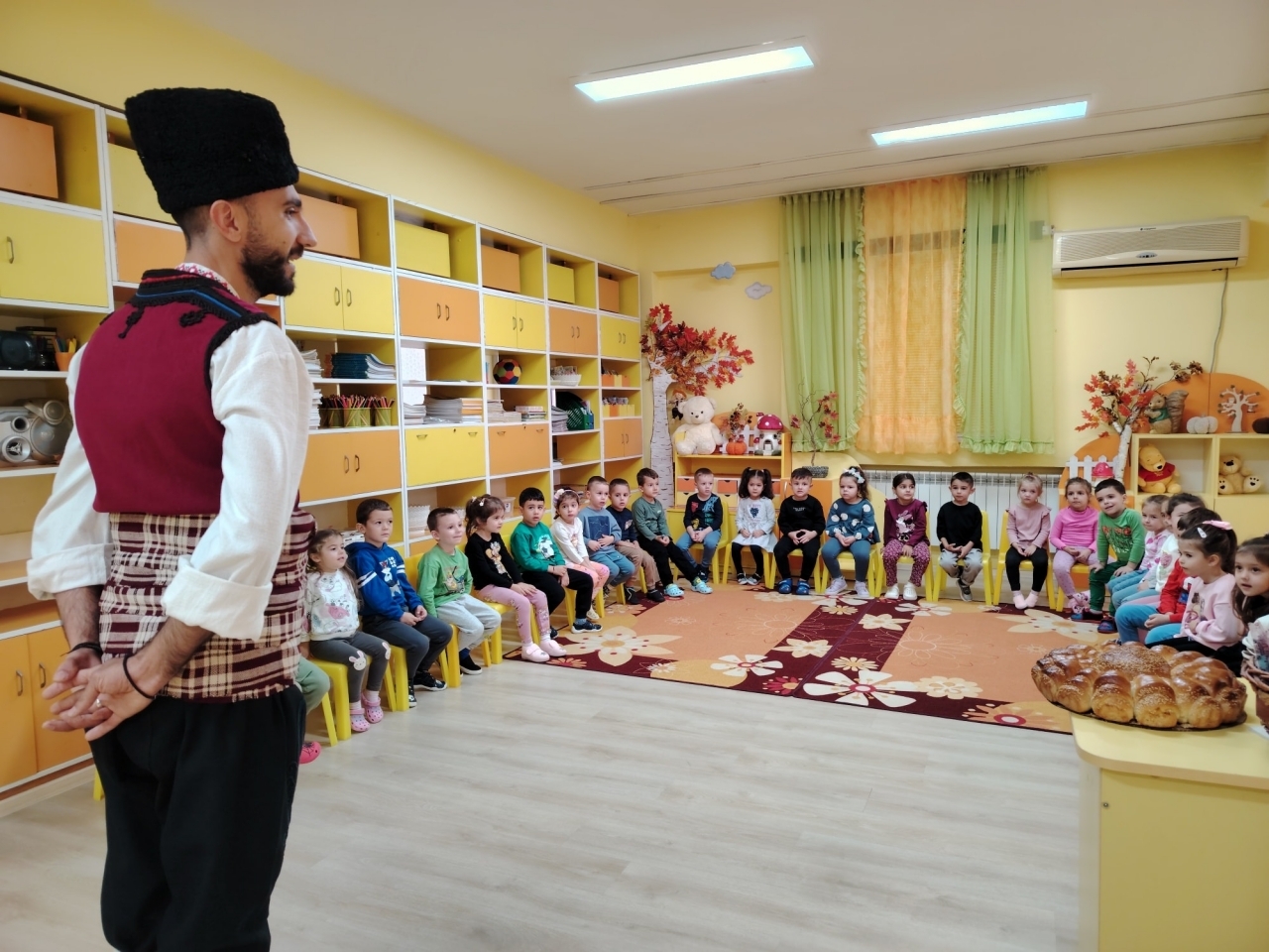 По покана на педагогическия екип гост на малчуганите бе г-н Чудомир Върбанов – баща на Калоян Върбанов и ръководител и хореограф на Клуб по български танци "Хоротропница" – Силистра. Той успя да потопи децата в магията на българския фолклор чрез интересен разказ за своята дейност, свързана с популяризирането на народните танци и традиции.