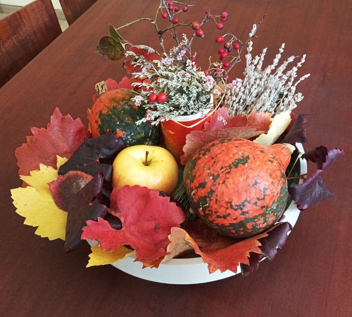"Есен е... Природата и плодовете на Добруджа", написа тя, описвайки подредената композиция от клонки шипка и глог, събрани по поляните около туристическата пътека на селото, както и ябълки, лавандула и цветни листа от собствената ѝ градина.