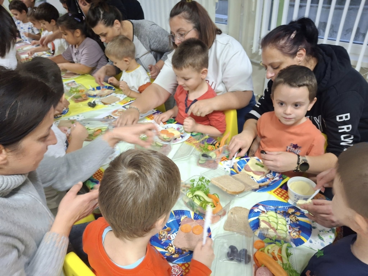 Децата, заедно със своите родители, се включиха с ентусиазъм в приготвянето на красиви и полезни сандвичи, които след това похапнаха с удоволствие. За десерт малките кулинари направиха пъстри плодови шишчета, превръщайки приготвянето на храната в истински празник на вкусовете и цветовете.