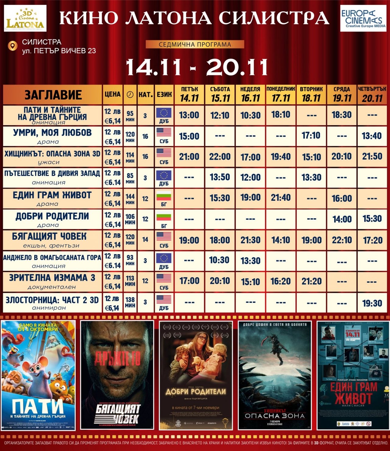 📅 Прожекциите се провеждат в зала на кино "Латона" – ул. "Петър Вичев" №23.