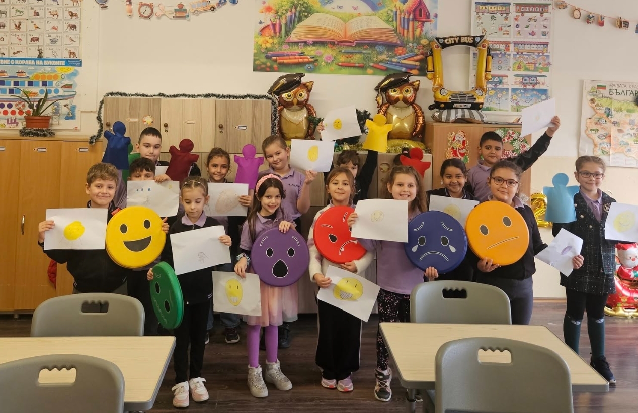 Най-малките ученици се потопиха в едно от най-важните учения – това да познават себе си и другите. С помощта на цветни пособия, рисунки и "емоционални" възглавнички, децата научиха, че няма лоши и добри емоции – всяка от тях е важна, а умението да я изразиш спокойно и разбираемо е истинска суперсила.