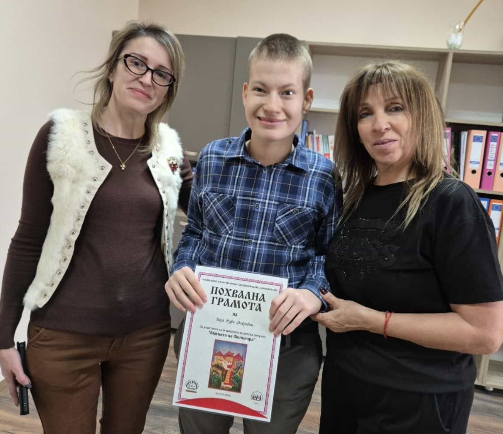 Възпитаникът на ЦСОП – Силистра, Бора Руфи Фахридин, получи заслужено признание за своя творчески труд и старание. Ученикът от организираната изнесена паралелка към центъра бе удостоен с Похвална грамота за участието си в престижния конкурс за детска рисунка "Магията на фолклора".
