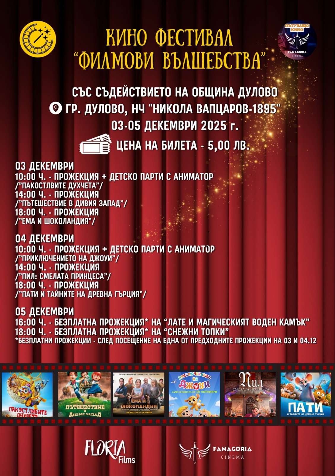 В началото на най-празничния месец от годината, Община Дулово и Народно читалище "Никола Вапцаров-1895" канят малки и големи на Кино фестивал "Филмови вълшебства". Събитието ще се проведе от 3 до 5 декември 2025 г. и обещава незабравими емоции пред големия екран.