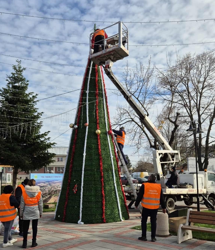 През последните дни екипите на Общинска администрация и Общинското предприятие работиха неуморно, за да пременят центъра на града. С помощта на специализирана техника бе украсена внушителната коледна елха, която вече е готова да засияе в пълния си блясък.
