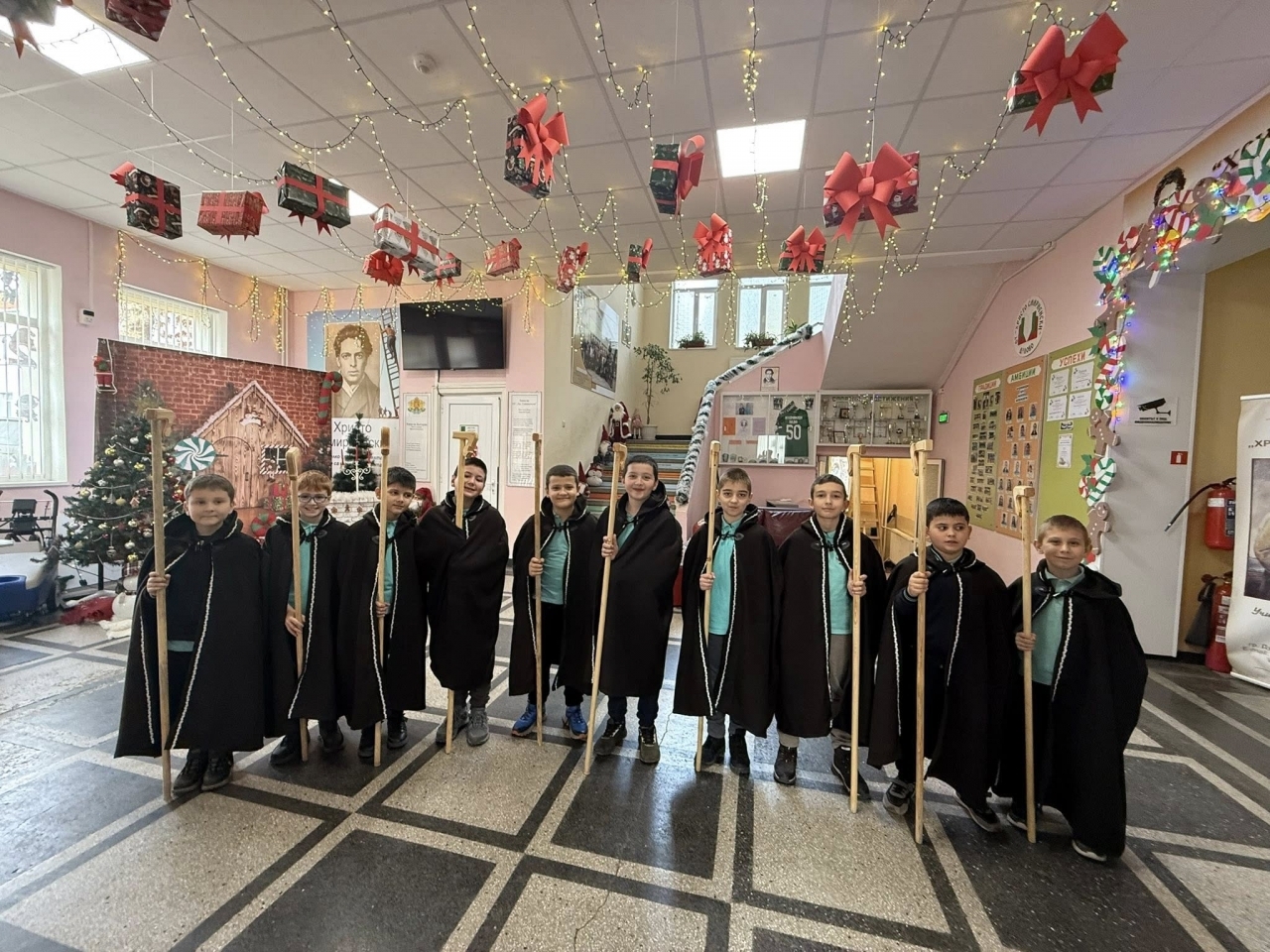 Момчетата, пременени в традиционни ямурлуци и въоръжени с характерните дървени геги, вече са готови да пресъздадат един от най-обичаните български обичаи. На кадъра от подготовката се виждат младите коледари, строени в празнично украсеното фоайе на училището, под небе от коледни подаръци.