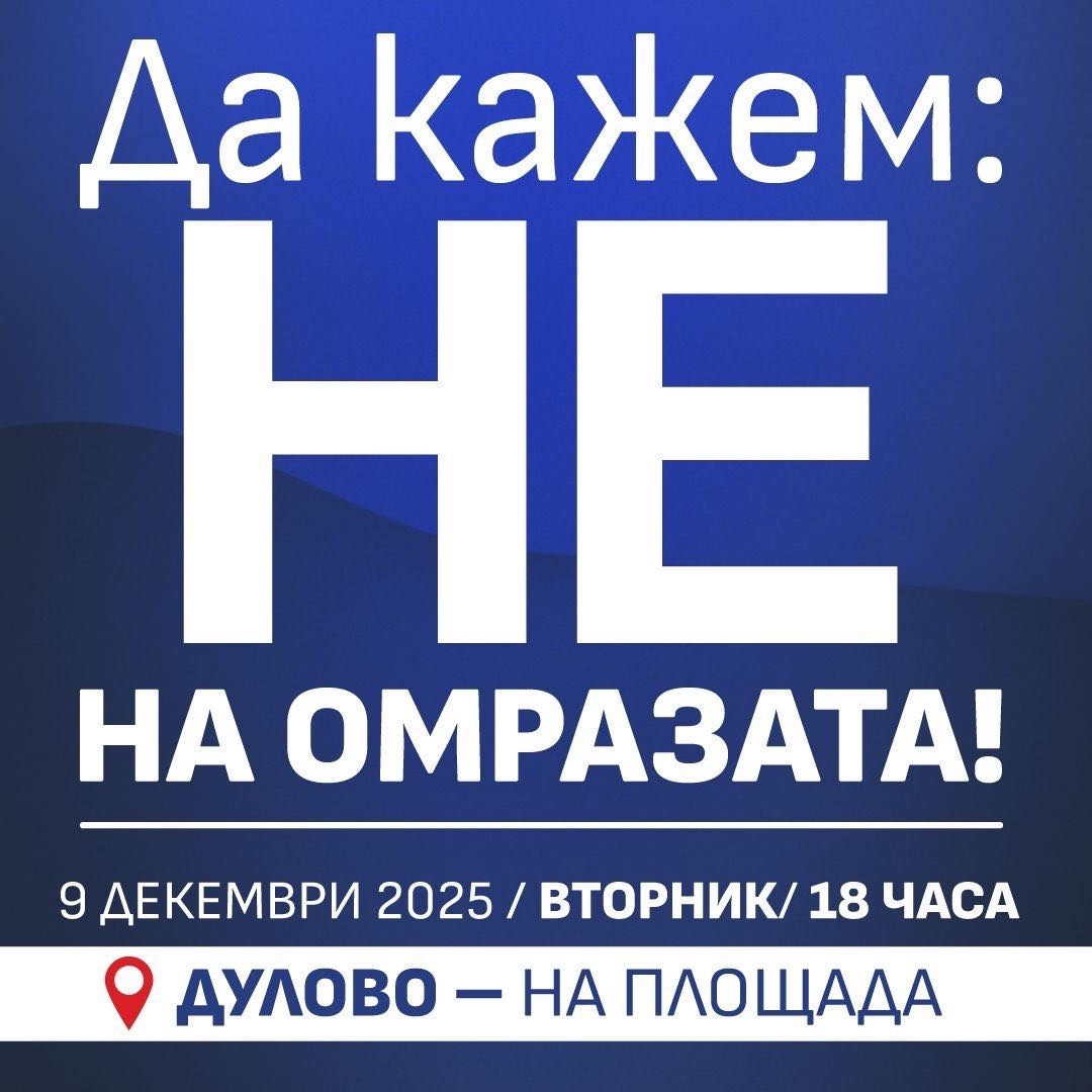 Днес, 9 декември, от 18:00 часа на централния площад в Дулово ще се проведе митинг, организиран от ДПС – "Ново начало", под посланието "Не на омразата". Събитието е част от национална инициатива, в рамките на която движението провежда контрапротести в над 20 града в страната в подкрепа на кабинета "Желязков".