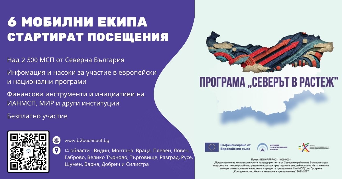 Изпълнителната агенция за насърчаване на малките и средните предприятия (ИАНМСП) стартира дейностите в подкрепа на бизнеса от Северна България. Създадени са шест мобилни екипа, които започват посещения в микро, малки и средни предприятия в областите: Видин, Монтана, Враца, Плевен, Ловеч, Габрово, Велико Търново, Търговище, Разград, Русе, Шумен, Варна, Добрич и Силистра. Чрез иновативния подход с посещения на експертите на място, предприятията ще получат информация и насоки за кандидатстване и участие в европейски и национални програми.