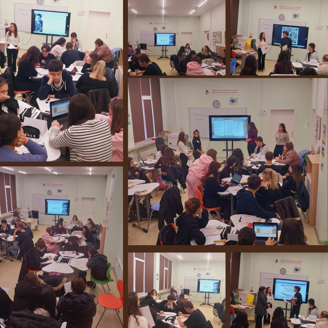 В занятието участваха учениците от 11.в клас, които демонстрираха високо ниво на мотивация, активност и умения за самостоятелна и екипна работа. Те работиха по предварително подготвени аналитични задачи, използвайки съвременни дигитални инструменти като Canva, QR кодове, CapCut и интерактивни платформи, чрез които представиха своите интерпретации по иновативен и креативен начин.