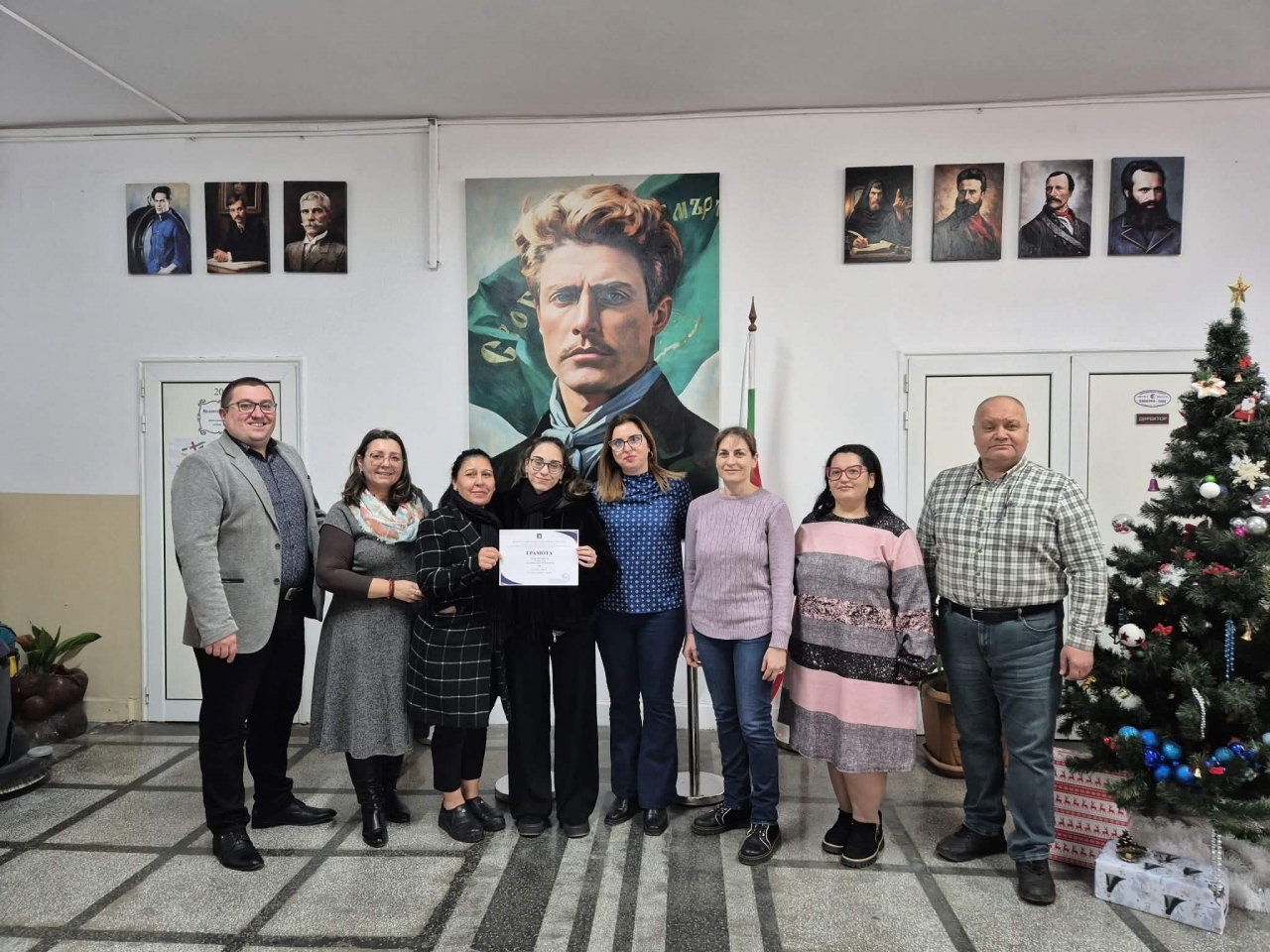 Грамотата за отличното представяне беше връчена тържествено от директора на училището г-н Стелиян Тотев в присъствието на заместник-директорите г-жа Александра Ангелова и г-жа Миглена Костова, г-жа Елица Атанасова – учител по немски език, г-н Сали Сали – учител по английски език, майката на ученичката и класния ѝ ръководител Мирена Занева.