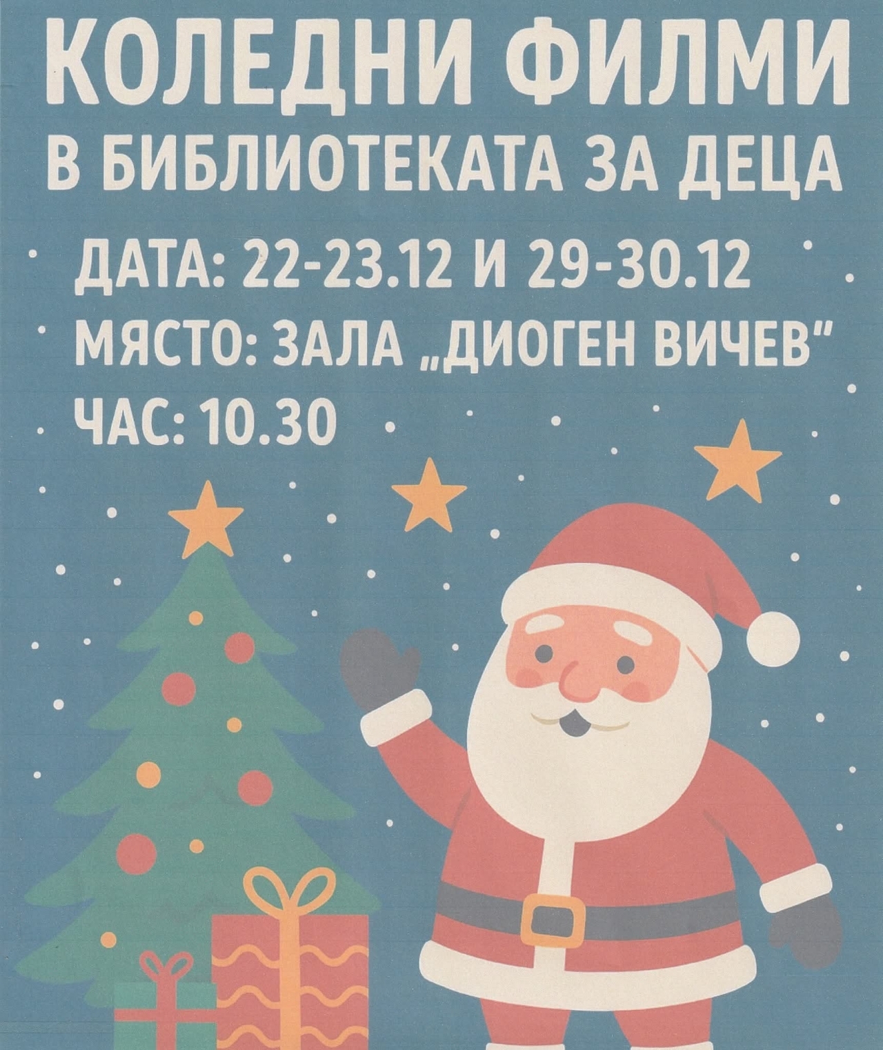 Прожекциите ще се състоят на 22–23 декември и 29–30 декември, с начален час 10:30 ч., в зала "Диоген Вичев". Инициативата е част от празничния културен календар на библиотеката и има за цел да създаде топла и вдъхновяваща атмосфера за децата по време на ваканцията.