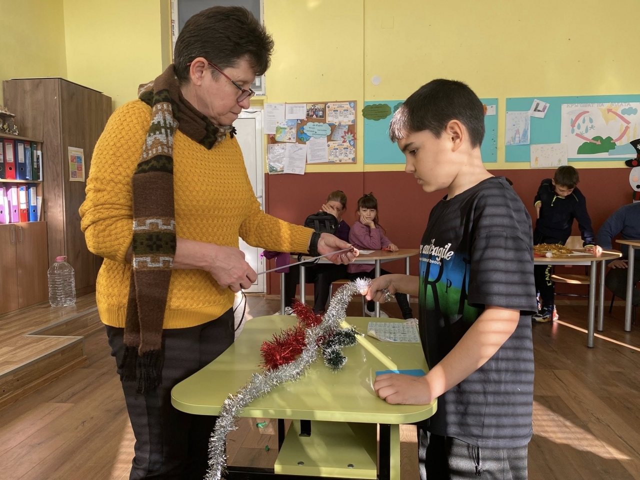 В рамките на заниманията ученици и учители работиха заедно по изработването на коледни украси и сувенири. Под вещото ръководство на преподавателите децата развиваха сръчност, въображение и търпение, като сами създаваха празнични елементи от различни материали. Атмосферата в класната стая беше изпълнена с ентусиазъм, съсредоточеност и радост от съвместната работа.