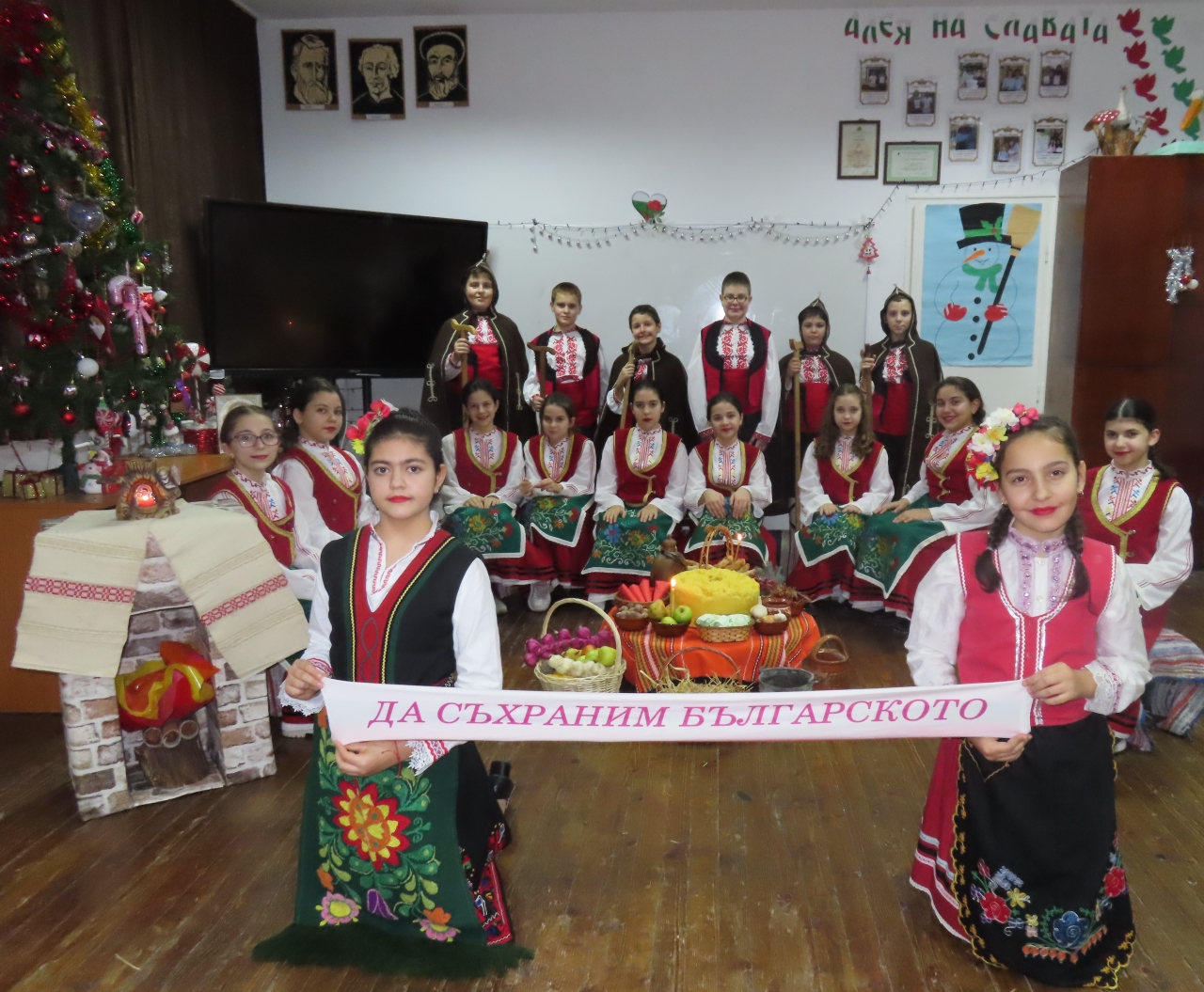 Учениците посрещнаха и коледари, които бяха почерпени по стар обичай с кравайче, ябълка, сушеница и руйно вино. За да бъде атмосферата напълно автентична, децата бяха облечени в народни носии, пейките – покрити с тъкани черги, а на софрата бяха подредени пита, бъклица и традиционни постни ястия. Над камината беше поставена икона, а в огнището гореше огън, който допълваше усещането за топлина и домашен уют.