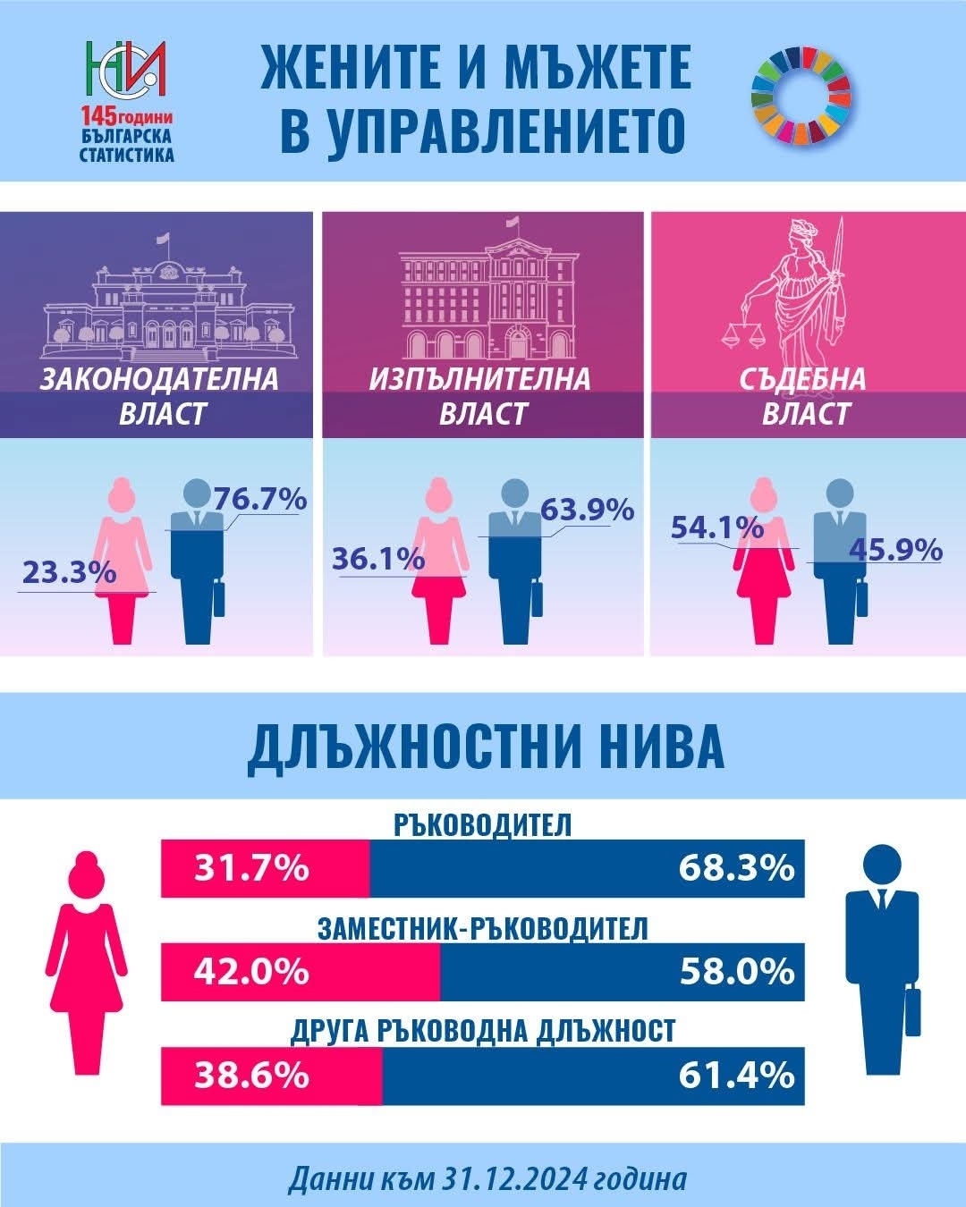 Към 31 декември 2024 г. най-висок дял на жени на ръководни позиции се наблюдава в съдебната власт – 54,1%, докато най-нисък е делът им в законодателната власт – 23,3%.