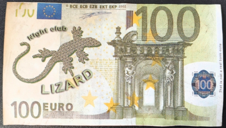 Банкнотата, използвана в експеримента, е имитация на 100 евро. На пръв поглед тя наподобява цветовата гама на европейската валута, но при по-внимателно вглеждане разликите са очевадни. Вместо архитектурни елементи и защитни знаци, на лицевата част е изобразено голямо влечуго, лого на нощен клуб "Lizard" (гущер), а надписът "Night club" замества стандартните обозначения. Нещо повече – отстрани на банкнотата ясно пише на английски език: "That is not a real bank-note" (Това не е истинска банкнота).