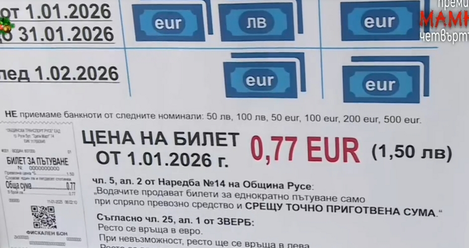 Градският транспорт в съседния на Силистра дунавски град Русе ще бъде безплатен до утре, включително, заради технически проблем с касовите апарати, възникнал при преминаването към работа и отчитане в евро. Това съобщиха от общинското транспортно дружество, цитирани от БНТ.