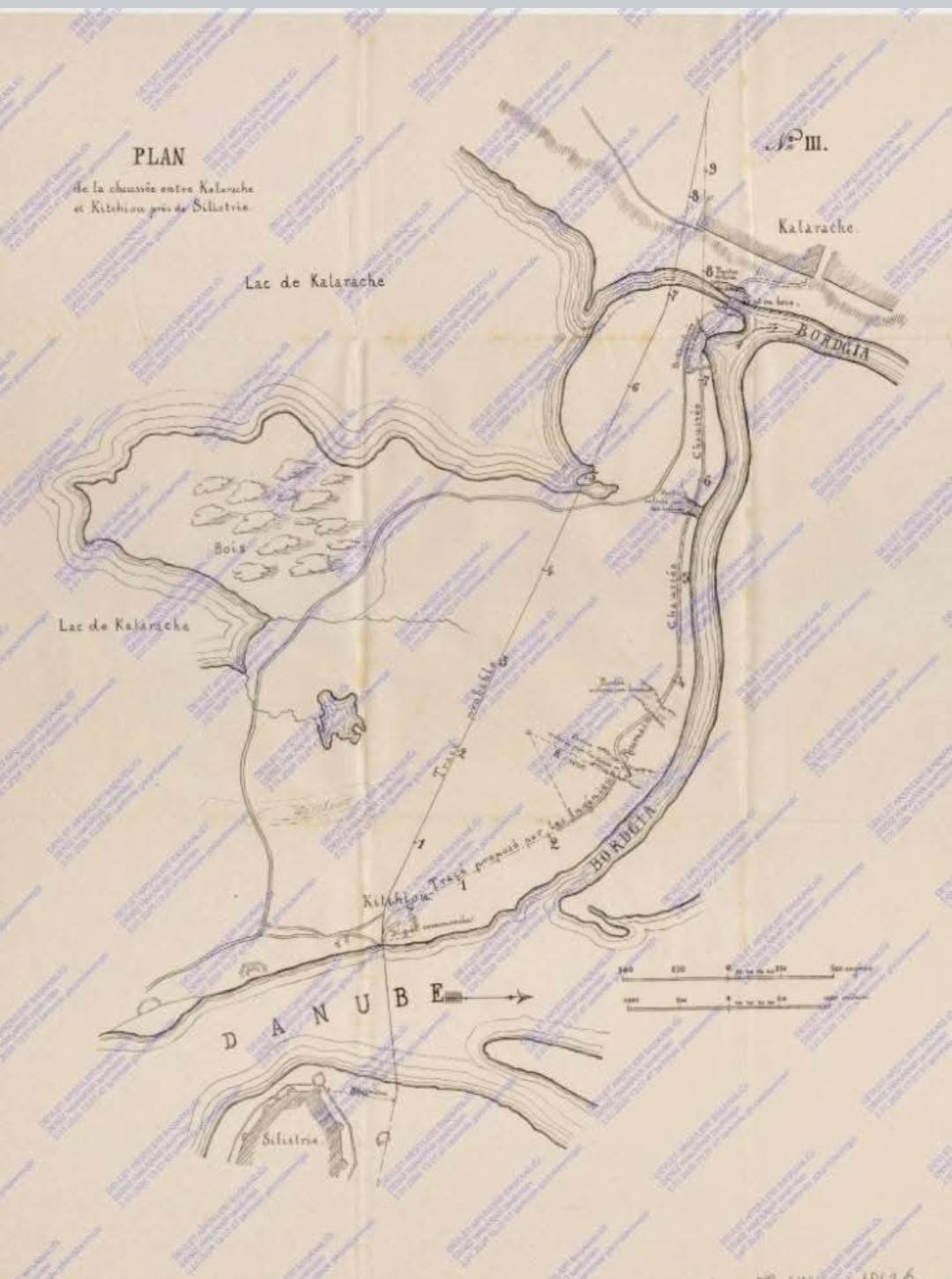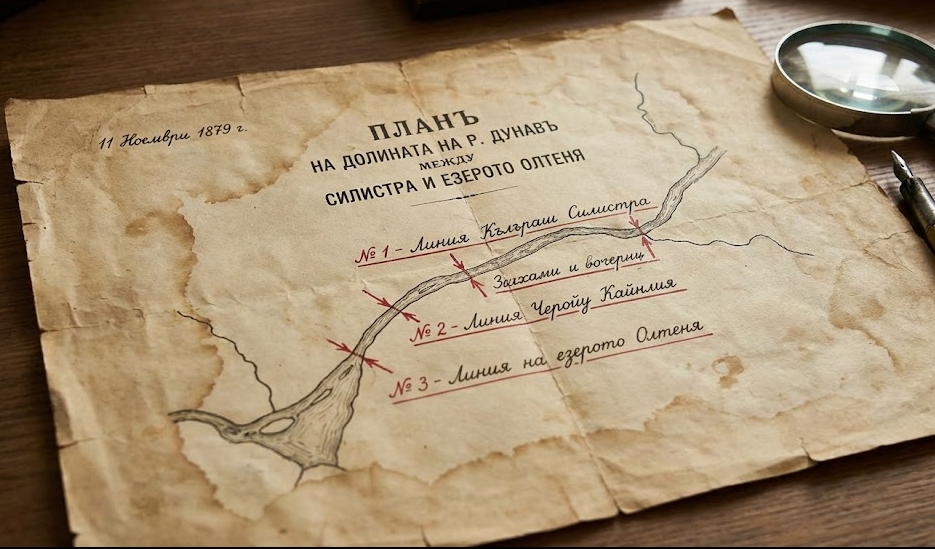 Ценен исторически документ, датиран от 11 ноември 1879 година, хвърля светлина върху инфраструктурните и стратегически планове за свързване на двата брега на река Дунав в района на Силистра непосредствено след Освобождението. Картата, озаглавена "План на долината на река Дунав между град Силистра и езерото Олтеня", показва детайлно три варианта за преминаване през реката.