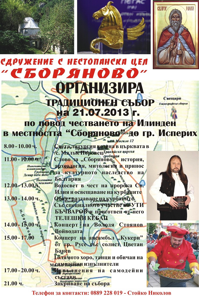 Кулинарният телевизионен шоумен Ути Бъчваров ще завърти уникален телешки кебап на границата между Добруджа и Лудогорието в рамките на 9-я събор "Сборяново" край град Исперих, съобщи Стойчо Николов, председател на едноименното сдружение. Другата звезда на събора е певецът войвода Володя Стоянов. Съборът е обявен за навръх Илинден, каквато е традицията, сложена де факто преди 9 години, но провеждана регулярно от 7 години насам. На съборите почти винаги е участвал като русенски владиката Негово светейшество Неофит, настоящ патриарх на БПЦ. Проявата ще започне със света литургия в църквата в село Малък Поровец, първата по рода си в обителта след ремонта в нея. Ансамбъл "Кукери" и оркестър "Хоро" от Русе ще бъдат сред изпълнителите в музикалната програма. Редом с тях ще са и десетки състави от Добруджа и Лудогорието. "Изненада засега е кой ще държи традиционното слово за празника, както и коя ще е известната личност, която ще се весели заедно с народа, уважил поканата за участие в него", каза още бизнесменът от село Паисиево, радетел на събора от учредяването му до днес.