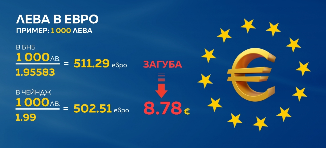 Разликата обаче може да се окаже чувствителна за гражданите. При курс от 1.99 лв. за евро, при обмяна на 1000 лева загубата е около 9 евро, а при 10 000 лева – близо 90 евро.