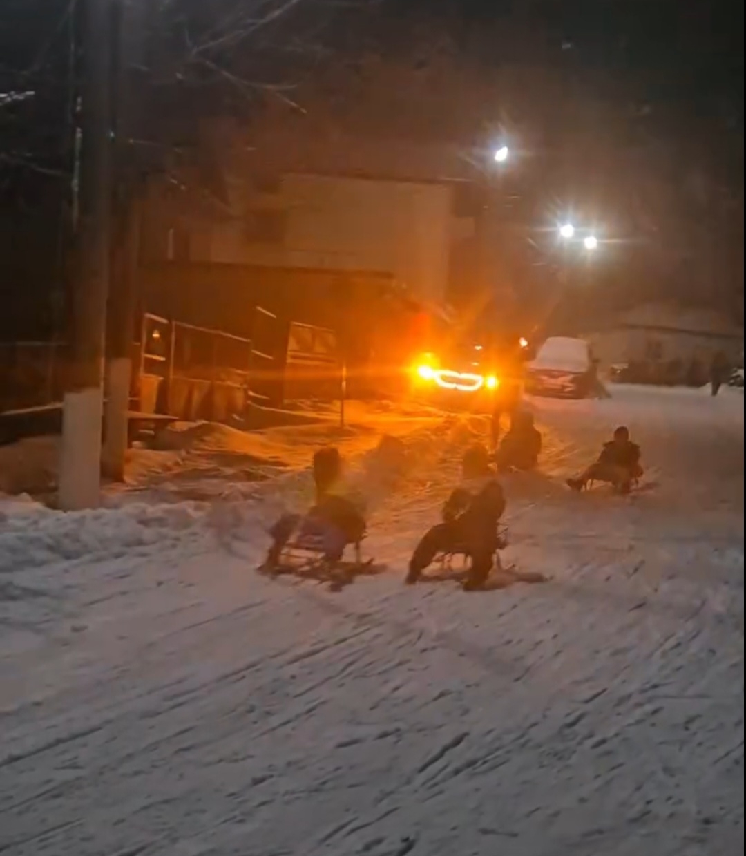 Улицата, превърнала се в импровизирана писта, бе осветена не от прожектори, а от фаровете на автомобилите на насъбралите се хора. Тази уникална атмосфера върна лентата назад към времената, когато зимите бяха дълги, а снегът се задържаше с месеци.