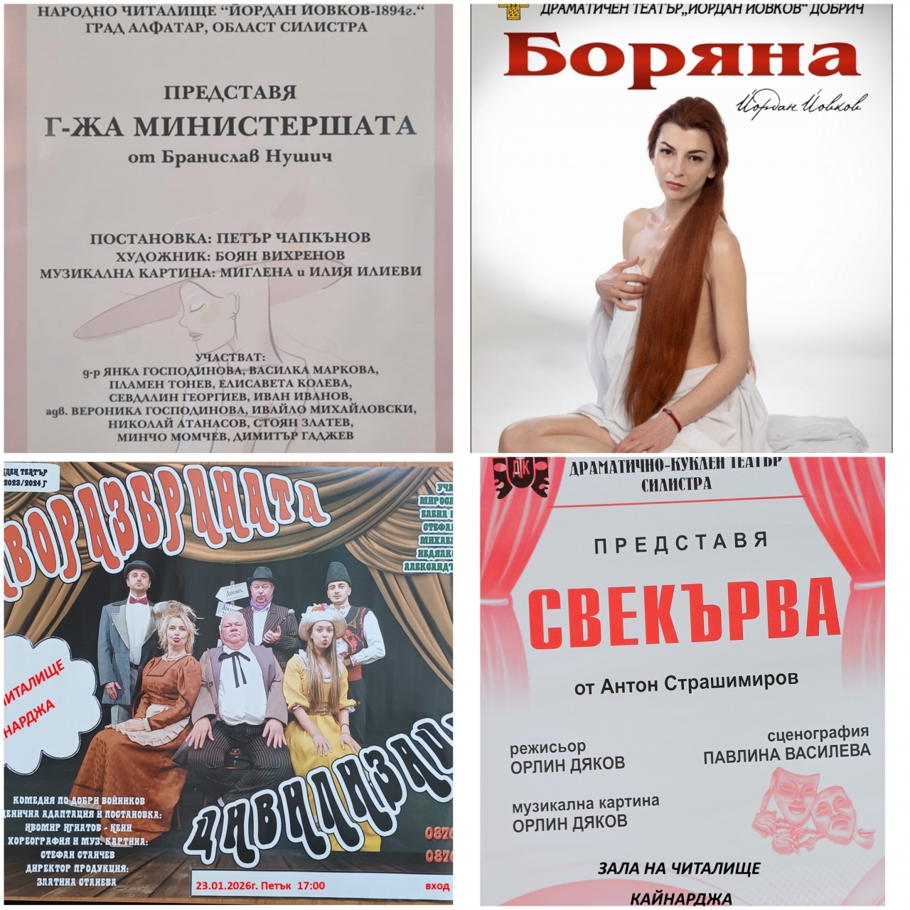 Народно читалище "Йордан Йовков-1894 г." – гр. Алфатар представя комедията "Г-жа Министершата" от Бранислав Нушич. Постановка – Петър Чапкънов; сценография – Боян Вихренов.