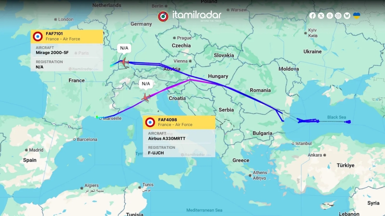 Операцията е била осигурена от самолет-танкер Airbus A330 MRTT (регистрация F-UJCH), който е кръжал в "орбита" над румънското крайбрежие, осигурявайки необходимото гориво за продължителна мисия дълбоко в черноморския басейн. Траекторията на полета показва, че бойните самолети са пресекли въздушното пространство на границата между България и Румъния, в непосредствена близост до Силистра, насочвайки се на изток.
