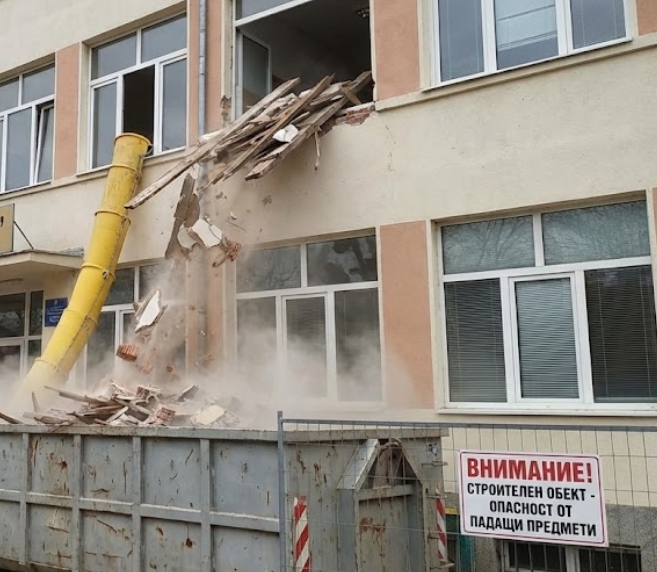 Инспекторите са констатирали, че при ремонт на сграда в училищен двор, строителните отпадъци са изхвърляни директно през прозорците, а площадката не е била оградена с плътна ограда. Единствената мярка е била сигнална лента, която не спира достъпа на ученици и персонал до опасната зона.