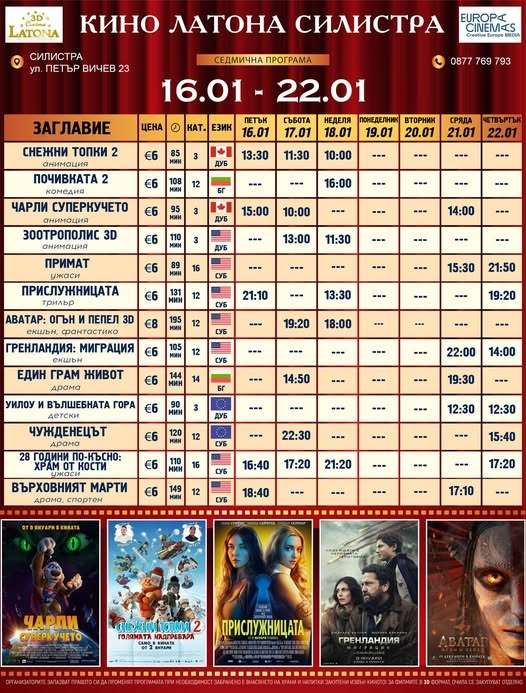 Кино "Латона" – Силистра представя новата си седмична програма за периода 16 – 22 януари, която предлага разнообразие от заглавия за деца, семейства и почитатели на различни филмови жанрове. В афиша са включени анимации, комедии, трилъри, драми и зрелищни продукции в 3D формат.