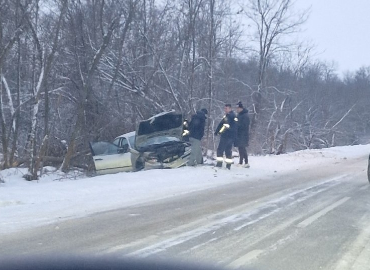 От кадър, заснет на мястото на инцидента, се вижда лек автомобил, който е излязъл извън пътното платно и се е озовал в крайпътните дървета. Пътната настилка е заснежена, а условията са зимни.