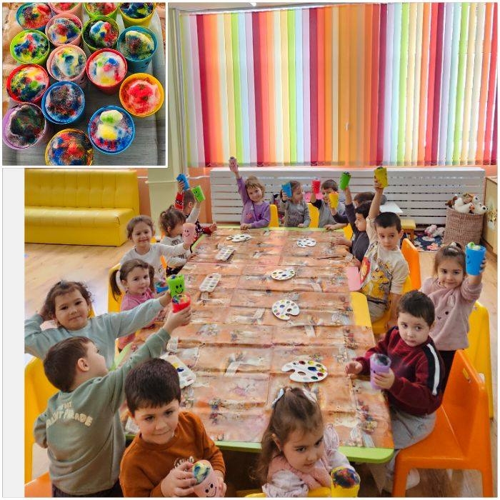 С особен интерес и вълнение децата събираха снежната чистота в малки чашки, които оцветяваха в ярки тонове, създавайки своеобразни "зимни мелби" – истински вълшебства, родени от играта и фантазията.
