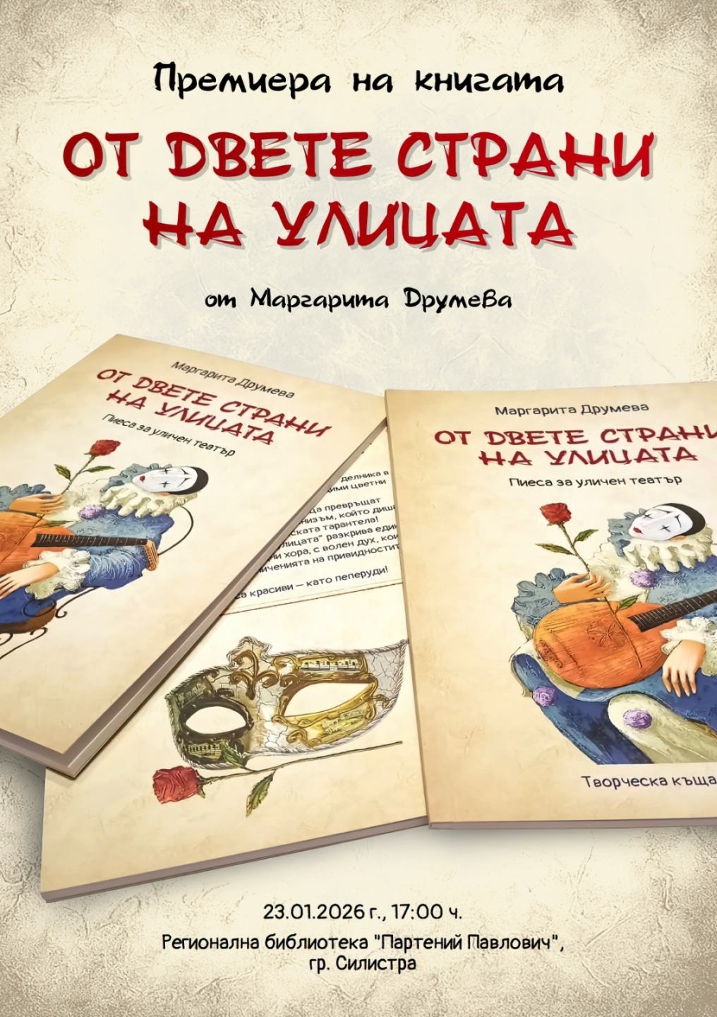 Премиера на книгата "От двете страни на улицата" от Маргарита Друмева ще се състои на 23 януари 2026 г. от 17:00 часа в Регионална библиотека "Партений Павлович" – Силистра. Събитието е част от културния календар на града и е с вход свободен.