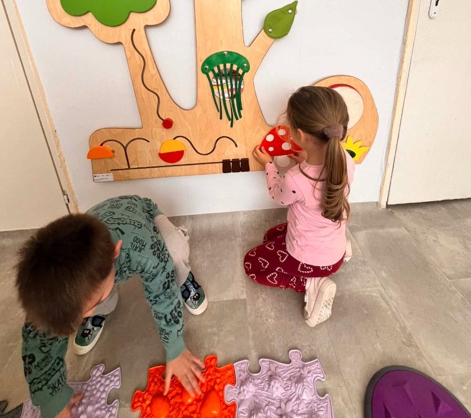 • Дидактични и сензорни материали – манипулационна стена, сензорен килим, интерактивна светеща маса, магнитна дъска и разнообразни образователни игри, които превръщат ученето в преживяване.