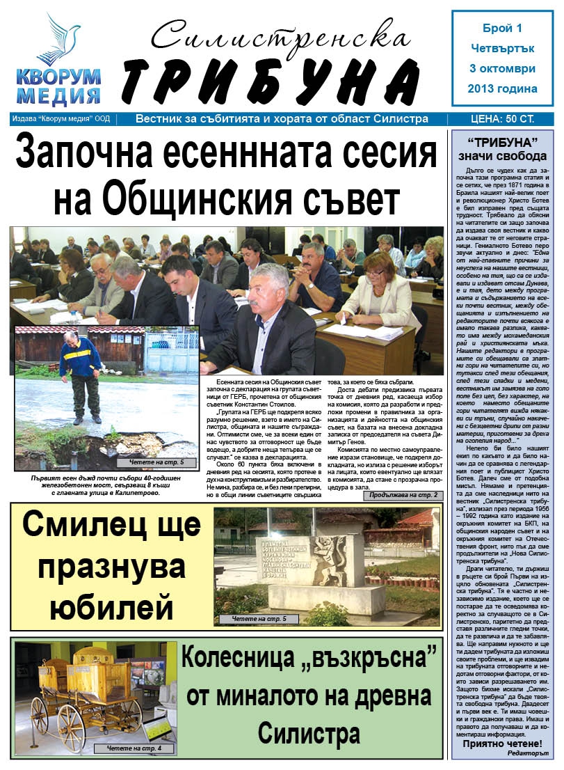 Вестник "Силистренска трибуна" се завръща на пазара. Драги читателю, утре ти ще можеш да държиш в ръцете си брой Първи на изцяло обновената "Силистренска трибуна". Тя е частно и независимо издание, което ще се постарае да те осведомява коректно за случващото се в Силистренско, паритетно да представя различните гледни точки, да те развлича и да те забавлява. Ще направим нужното и ще ти дадем трибуната да изложиш своите проблеми, и ще извадим на трибуната отговорните и недотам отговорни фактори, от които зависи разрешаването им. Защото бихме искали "Силистренска трибуна" да бъде твоята свободна трибуна. Двадесет и първи век е. Ти имаш човешки и граждански права. Имаш и правото да получаваш и да коментираш информация.