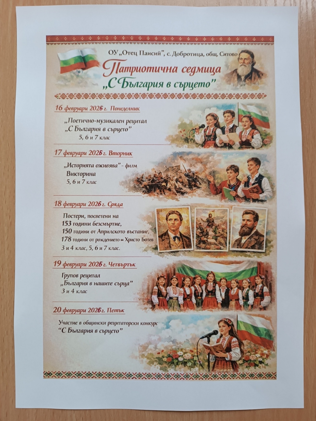 Основно училище "Отец Паисий" в село Добротица, община Ситово, организира наситена с емоции и родолюбие Патриотична седмица под надслов "С България в сърцето". Събитията ще се проведат в дните от 16 до 20 февруари 2026 г. и ще обхванат ученици от началния и прогимназиалния етап.