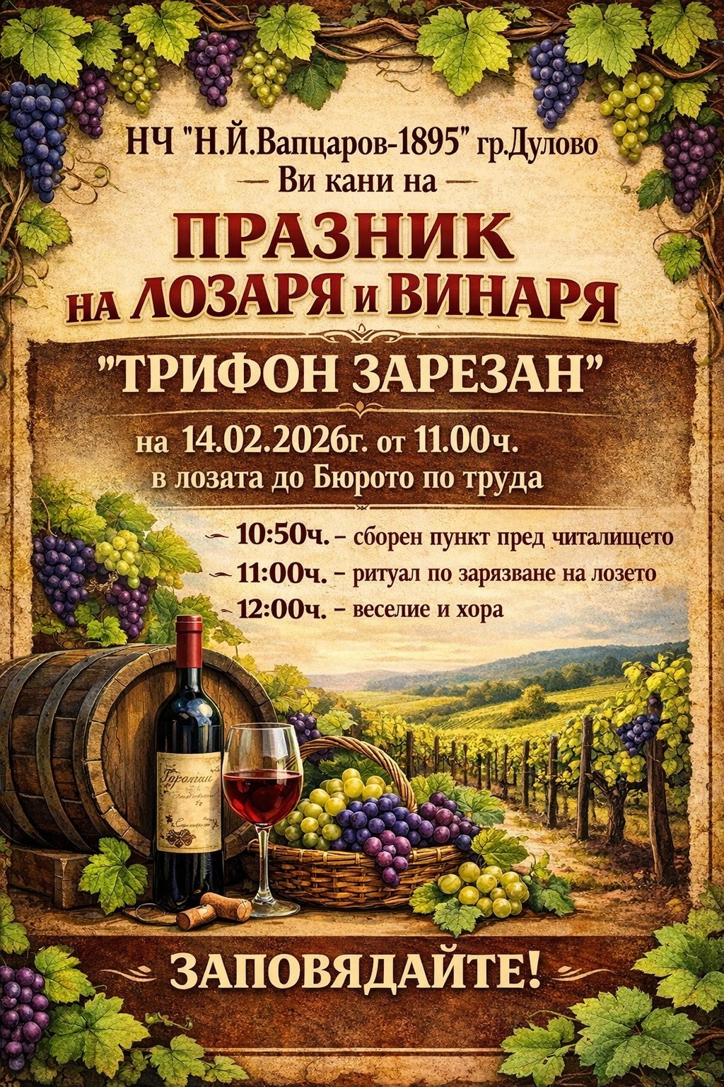 Жителите и гостите на град Дулово са поканени да отбележат заедно един от най-тачените български народни празници – Деня на лозаря и винаря "Трифон Зарезан". Организатор на събитието е НЧ "Н. Й. Вапцаров – 1895" – гр. Дулово.