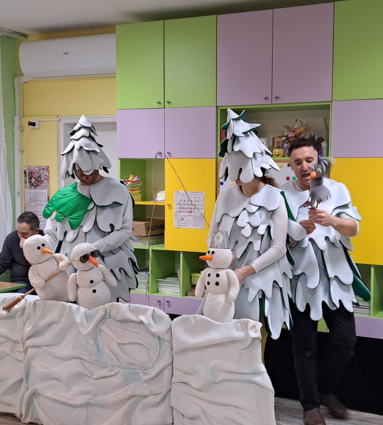 Атмосферата в занималнята бе преобразена с впечатляващи костюми и декори. Актьорите, превъплътени в оживели заснежени ели, и куклите-снежни човеци създадоха истинска зимна магия за малките зрители.