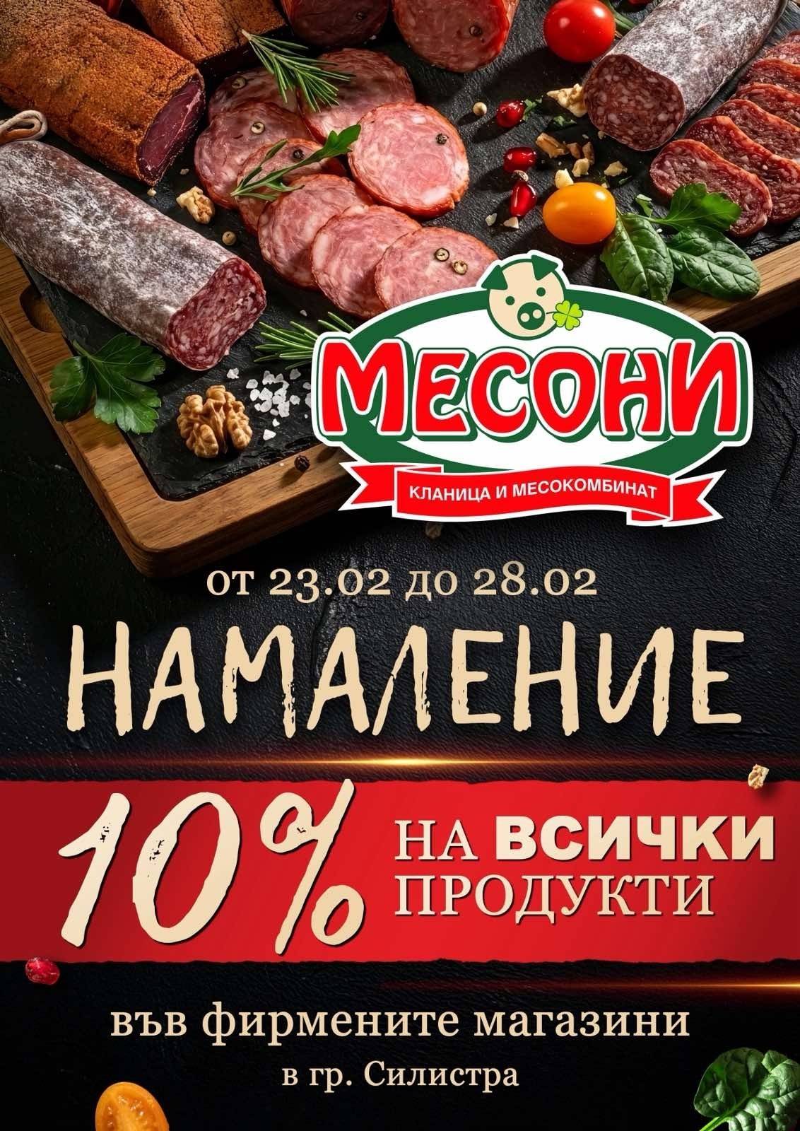 От днес, 23 февруари, във фирмените магазини на "Месони" в Силистра е в сила 10% намаление на целия асортимент. Кампанията ще продължи до 28 февруари включително.