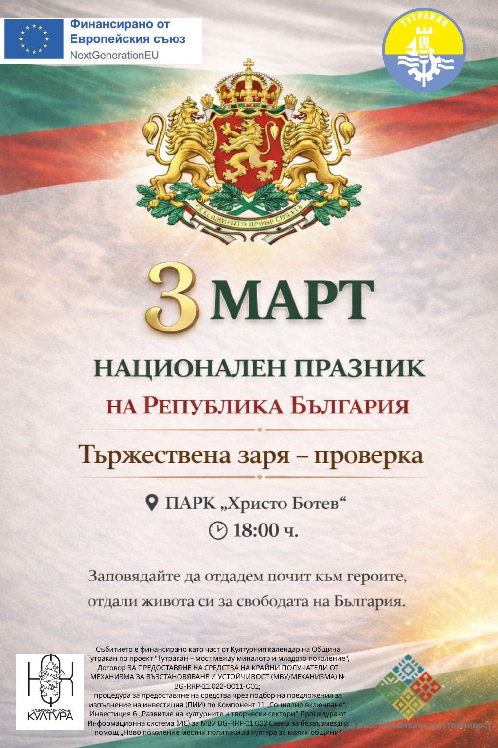 По повод Националния празник на Република България – 3 март, Община Тутракан отправя покана към жителите и гостите на града да се включат в тържествена заря – проверка.
