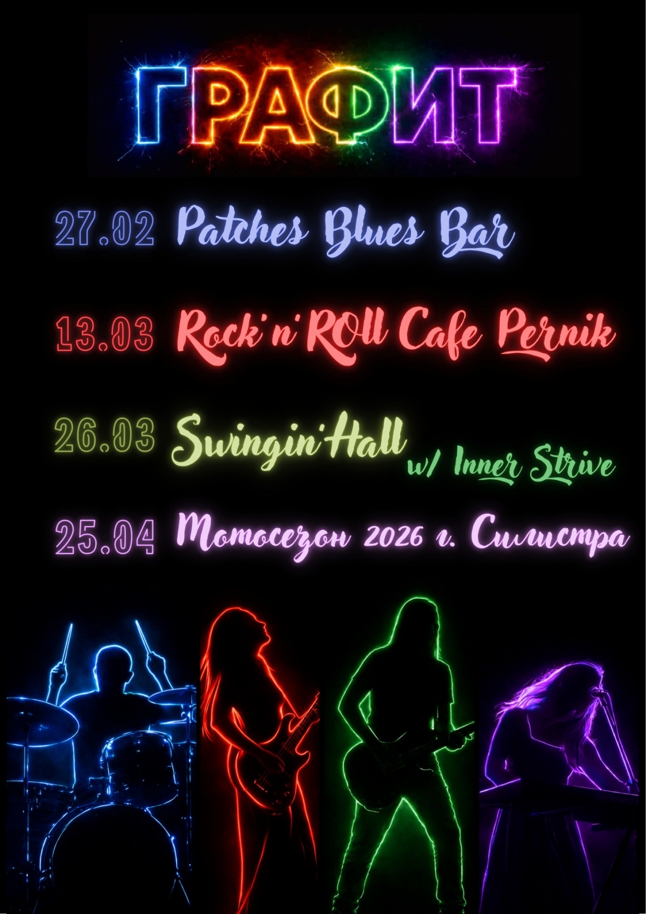 Силистренската рок банда "Графит" обяви нови дати от концертния си график в социалните мрежи, като до края на април групата ще излезе на сцена в няколко града в страната, а кулминацията ще бъде участие в родния град.