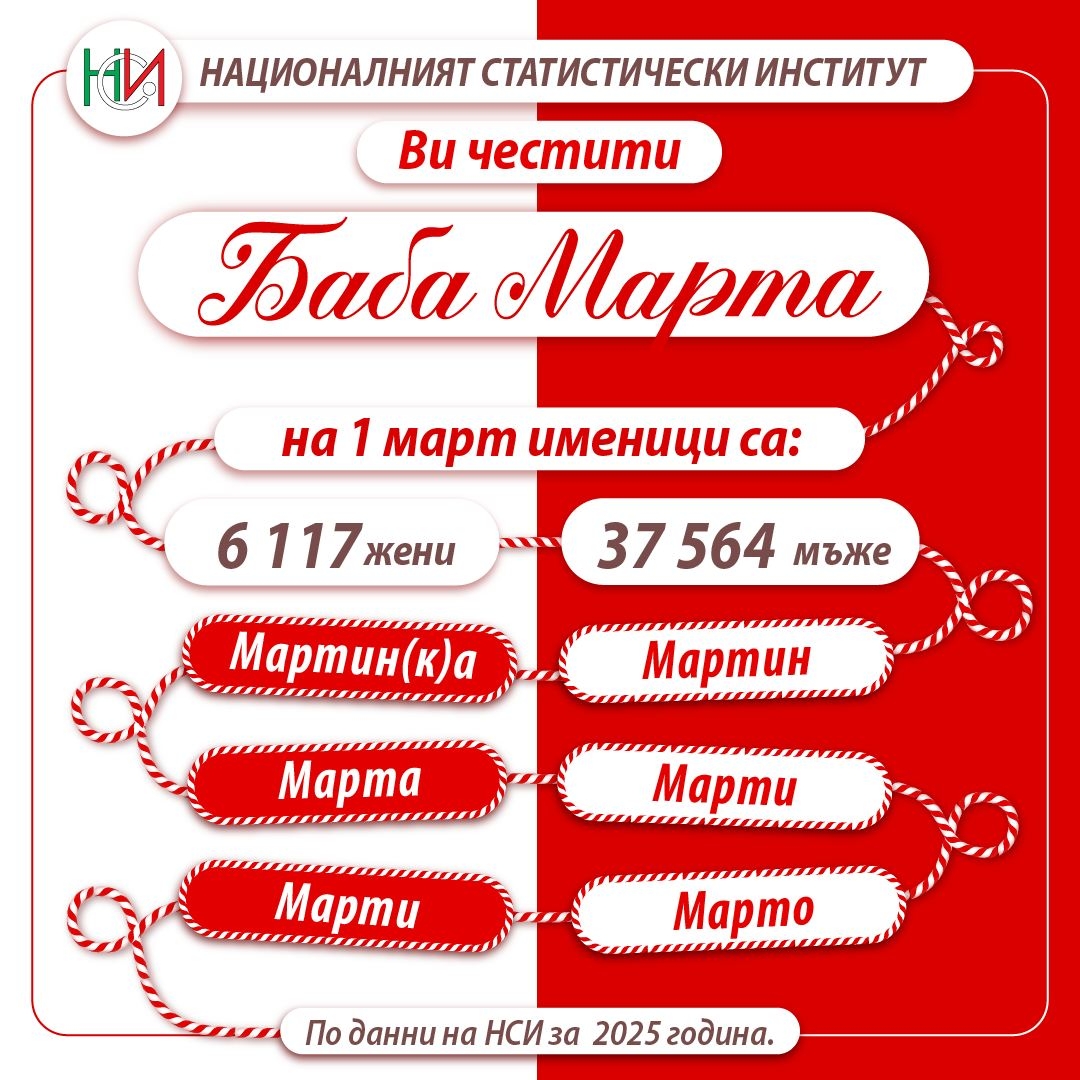 Националният статистически институт отправи поздрав по повод Баба Марта – един от най-обичаните български празници, носещ символика на здраве, надежда и ново начало.